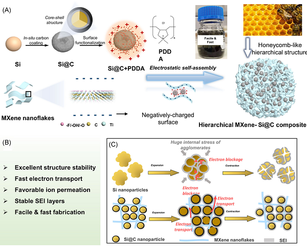图8 MXene‐Si@C的制作流程,优点及结构的功能的示意图