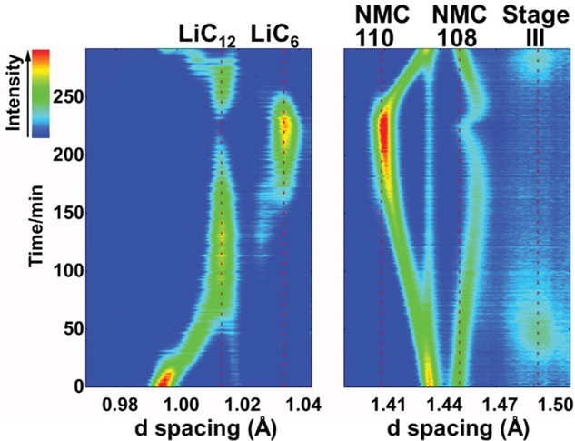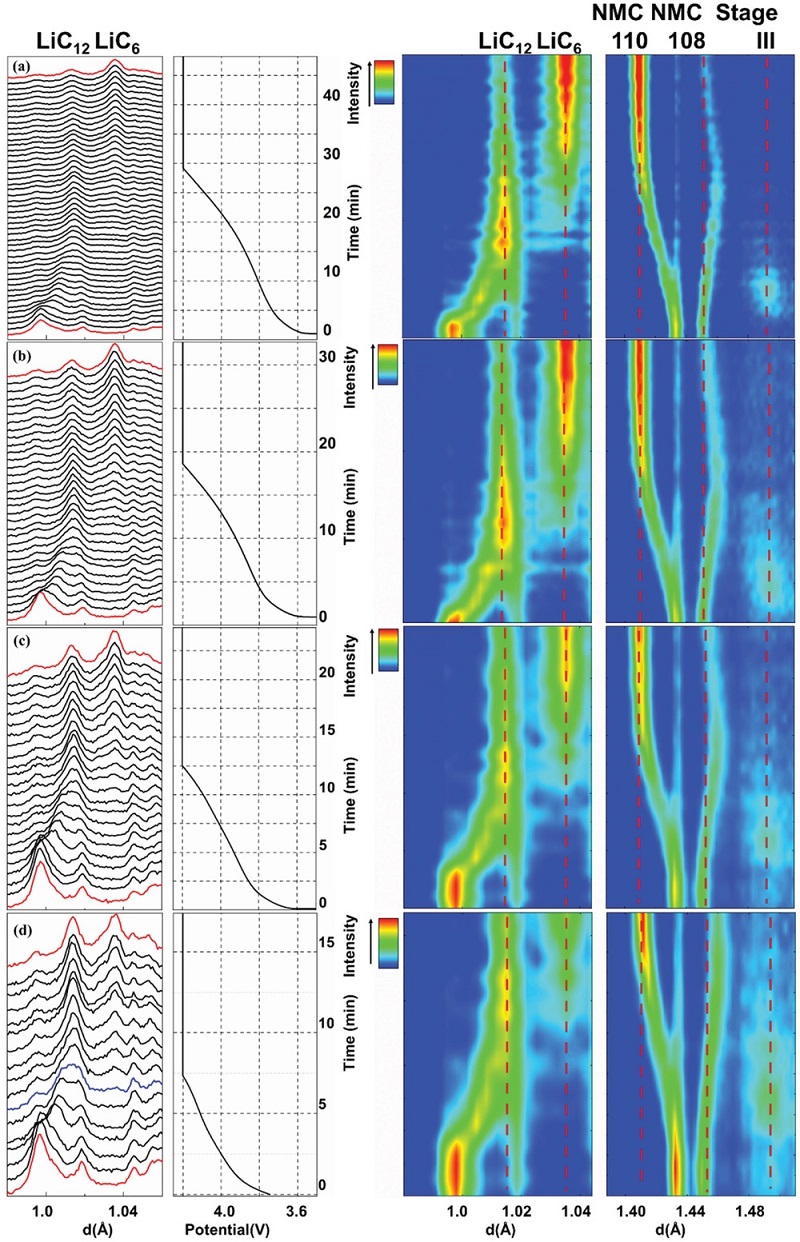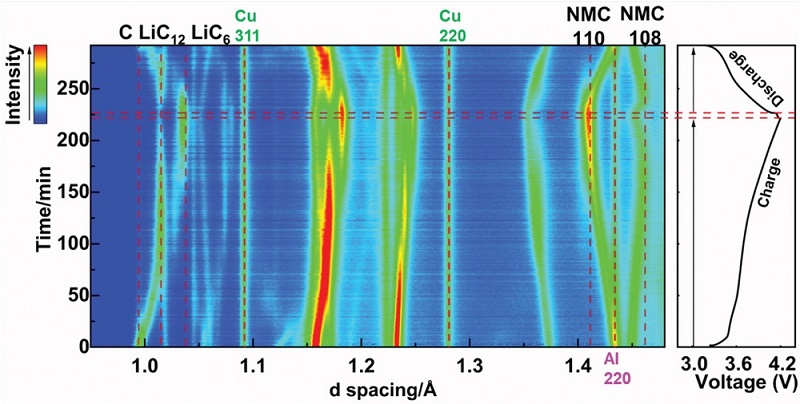 图二、石墨和NMC622在0.27 C充电和1 C放电下的结构/相演变