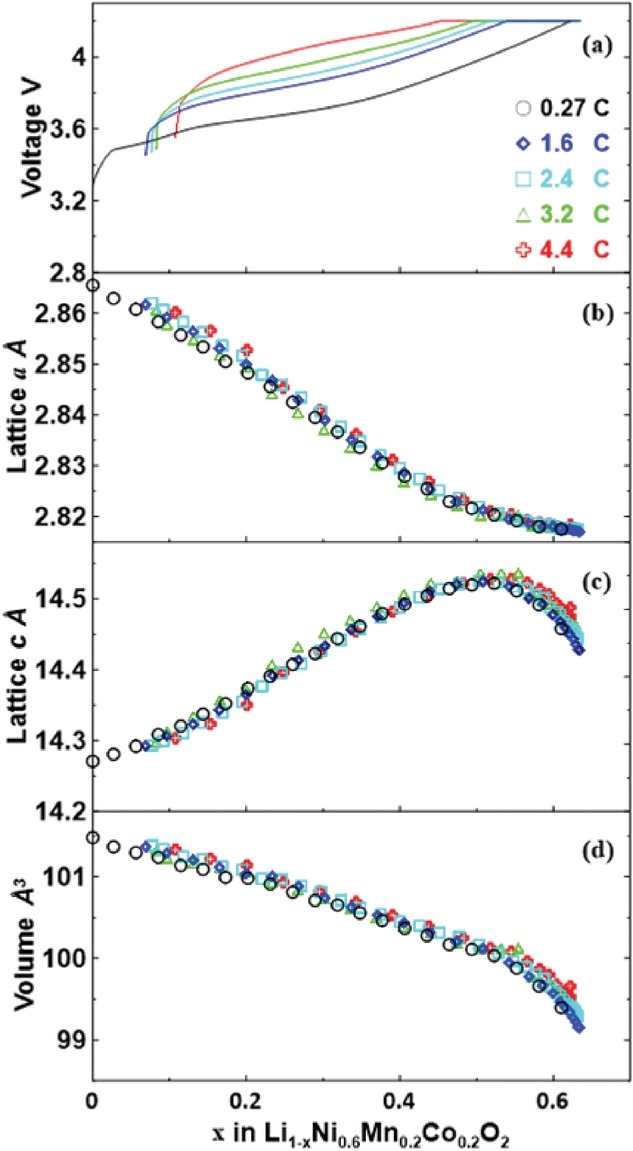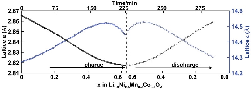 图四、NMC622在0.27 C充电和1 C放电下的晶格参数a和c演变