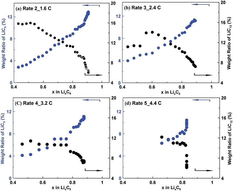 图六、不同充电速率下充电过程中石墨负极的相演变