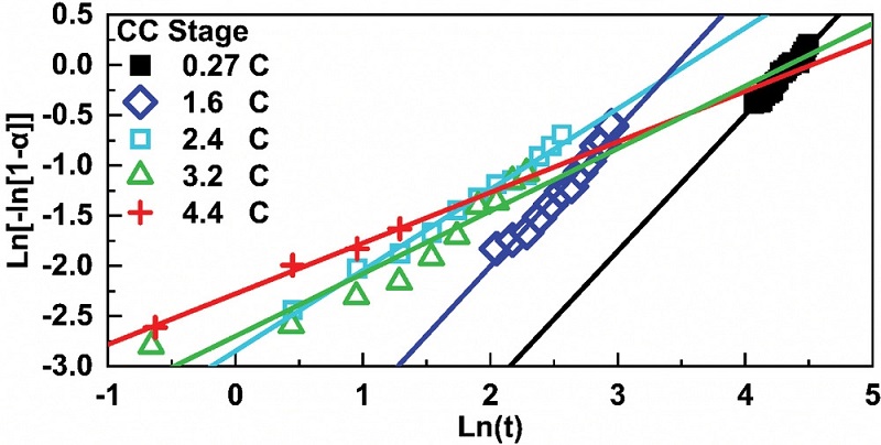 图八、CC阶段在5种充电率下LiC6的Sharp-Hancock图