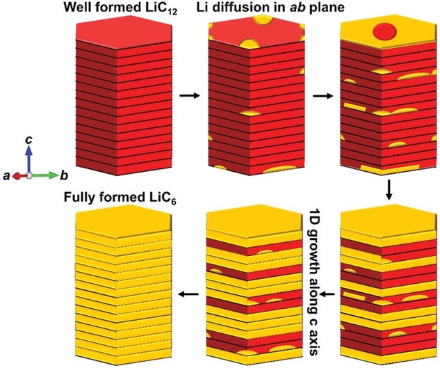图三、在0.27 C充电和1 C放电下形成阶段-III(LiC30)、阶段-II(LiC12)和阶段-I(LiC6)