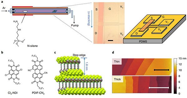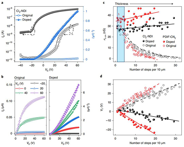 (c,d)掺杂效应σs和VT与晶体台阶密度之间的关系。Cl2-NDI(黑色)和PDIF-CN2(红色)