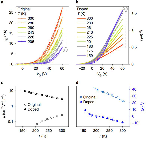 (a,b)同一Cl2-NDI晶体在其未掺杂和掺杂态下的FET ID-VG特性的温度依赖性关系;