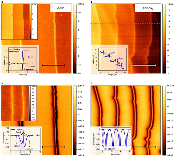 (c,d)掺杂的PDIF-CN2单晶的AFM形貌和SKPM电位图像。