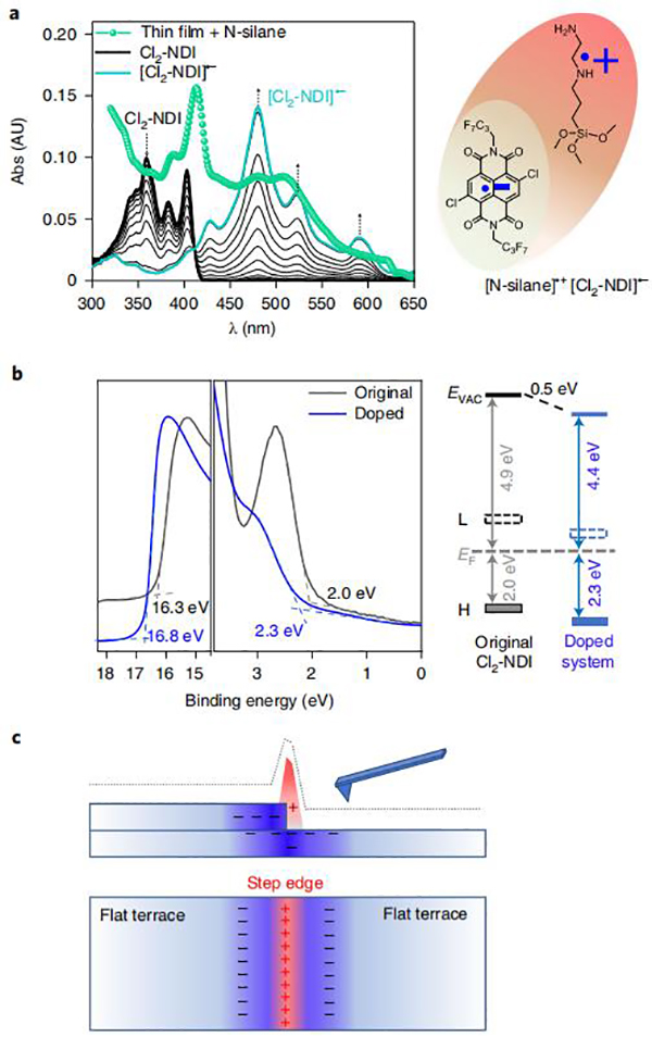 近日,美国明尼苏达大学C Daniel Frisbie教授和何涛教授(共同通讯作者)描述了两种有机半导体单晶独特的,特定位置的n型表面掺杂机制,该机制显著改善了电子传输,并为掺杂诱导的空间电荷提供了前所未有的证据。同时,表面掺杂化学专门针对晶体台阶边缘,即已知的电子陷阱,同时钝化陷阱并释放流动电子,对电子传输具有深远的影响。场效应电子迁移率增加了10倍,其依赖于温度的行为从热激活转变为带状。本文提出的定点策略是一种有效的掺杂有机半导体方法,与随机分布的置换杂质的常规氧化还原化学不同。最重要的是,作者还首次通过开尔文探针力显微镜证实了掺杂诱导的电子云气氛,从而在有机体系中印证了经典无机半导体物理学的掺杂理论。。相关研究成果以“Site-specific chemical doping reveals electron atmospheres at the surfaces of organic semiconductor crystals”为题发表在Nature Materials上,被选为亮点论文专门评述。
