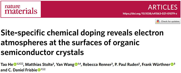 文献链接:“Site-specific chemical doping reveals electron atmospheres at the surfaces of organic semiconductor crystals”(Nature Materials,2021,10.1038/s41563-021-01079-z)