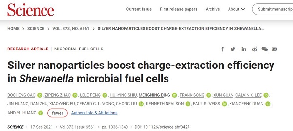 文献链接:Silver nanoparticles boost charge-extraction efficiency in Shewanella microbial fuel cells (Science 2021, doi: 10.1126/science.abf3427)