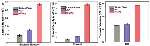 加州大学洛杉矶分校的段镶锋/黄昱夫妇联合报告了一个合理的策略,以促进用还原氧化石墨烯-银纳米颗粒(rGO/Ag)支架构建的希瓦氏菌MFCs的跨膜和细胞外电子传输过程。由此产生的希瓦氏菌-银MFC可提供的最大电流密度为3.85 mA/cm2,功率密度为0.66 mW/cm2,单细胞周转频率为8.6×105/s,这些都是迄今为止报告的性能最好的MFC。此外,混合MFC具有出色的燃料利用效率,库仑效率为81%。该文章近日以题为“Silver nanoparticles boost charge-extraction efficiency in Shewanella microbial fuel cells”发表在知名顶刊Science上。