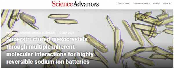 来自四川大学的吴昊、张云和郭俊凌的联合研究团队在《Science Advances》发表题为“Superstructured mesocrystals through multiple inherent molecular interactions for highly reversible sodium ion batteries”的文章(并入选在线封面论文Featured Image)。本文报道了一种层次化金属-多酚介晶的自下而上的合成方法,其中自组装以时空可控的方式在不同的长度尺度上进行。基于酚类的配位络合物组织成超分子线,这些线组装成三级纳米级的细丝,最后堆积成四元介晶。层次化有序结构在热转化为金属-碳混合框架后被保留,并可赋予钠离子电池优异的性能,在200 A g-1的超高倍率下可提供72.5 mAh g-1的比容量,在5 A g-1的电流密度下循环15000次,仍可保持90%的容量。因此,天然多酚的这种层次化结构有望得到广泛的应用。