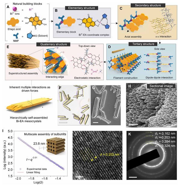 在这里,本文将一个小的平面天然酚类分子[鞣花酸(EA),一种存在于水果、蔬菜和树皮中的杂四环分子]与铋离子(Bi3+)自组装成具有有序四元结构的分级金属-多酚介晶(图1A到E)。小角X射线散射(SAXS)和计算热化学模拟揭示了一个时空分层自组装过程,在EA分子之间较强的p-p相互作用的指导下,配位络合物(基本结构)延伸到超分子线(二级结构)形成不同的络合物。然后,二次丝通过结合的溶剂分子之间的偶极-偶极相互作用组装成纳米级的细丝(三级结构),最后通过静电作用(四元结构)将细丝组装成更高阶的微米级介晶。之后,这些金属-酚类介晶可以在保持层次化有序结构的同时,以形态合成的方式转变为BiC复合材料,这使得它们可以用作钠离子电池(SIB)的高性能负极材料。