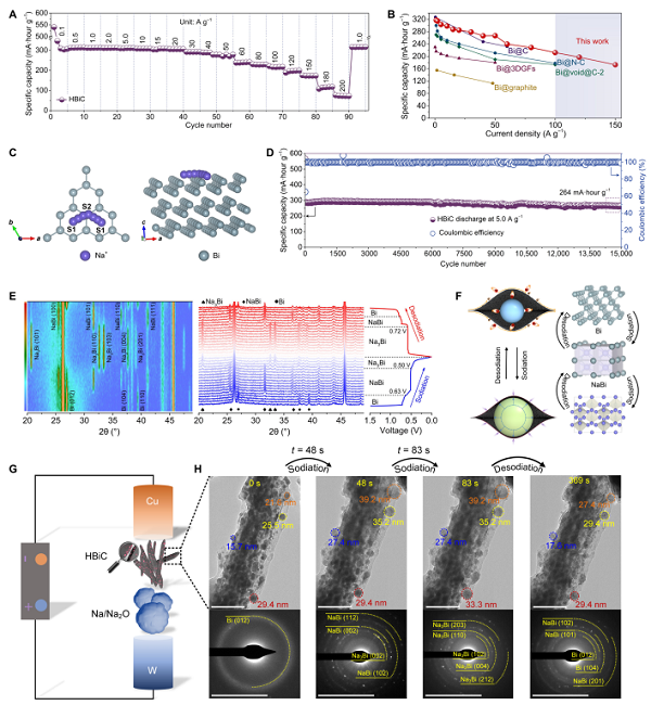 该复合材料用于钠离子电池负极材料的首次放电容量为449 mA·h g−1,充电容量为359 mA·h g-1,初始库仑效率为79.9%,优于目前报道的合金化型正极电池。在相对较低的电流密度下(1.0A、2.0A和10A g−1),平均倍率容量分别达到317、315和297 mA·h g−1(图4A)。当电流密度增加到50 A g‒1时,与1.0 A g‒1相比,容量保持率为83%。即使在200 A g‒1的超高电流密度下(充/放电一次时间不足1秒),依然能够释放出72.5 mAh g‒1的高可逆比容量。 HBiC的倍率性能是目前钠离子电池中报道的铋基负极材料中最高的(图4B)。此外,原位分析测试与电化学性能结果表明,充放电过程中HBiC具有良好的结构稳定性,在5.0A g−1的高电流密度下,15000次循环后的容量仍可达263mA·h g−1,容量保持率为90.6% (图4D)。