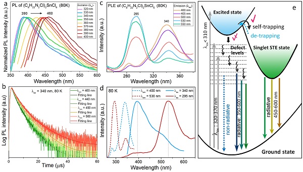图4. Sb3+掺杂(C8H22N2Cl)2SnCl6的变温荧光表征及其激发态载流子动力学过程示意图