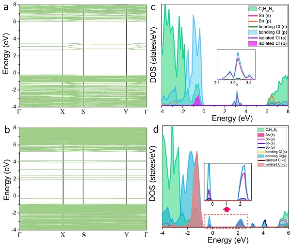 图5. Sb3+掺杂前后(C8H22N2Cl)2SnCl6的第一性原理计算结果