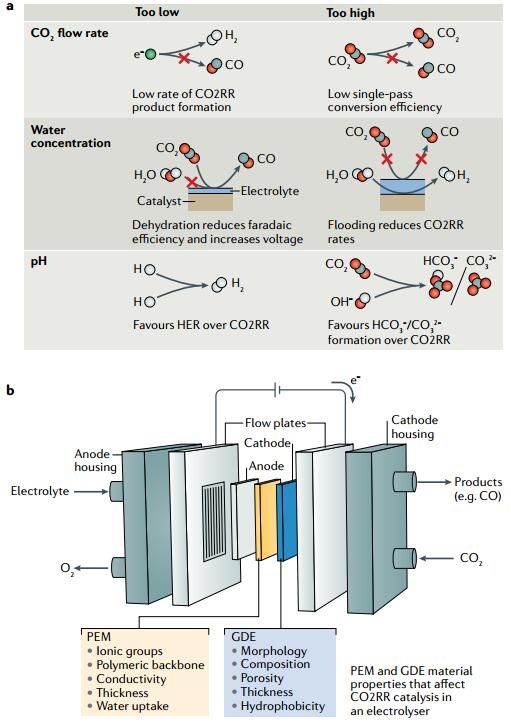 (a)低和高CO2流速、局部pH值和水浓度对CO2RR相关关键过程有害影响的定性表示的示意图;