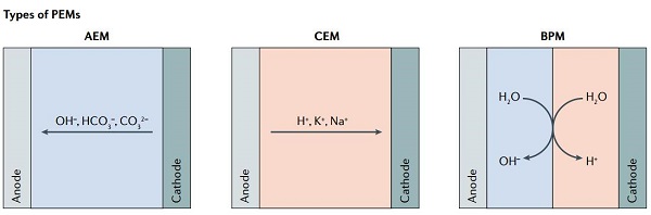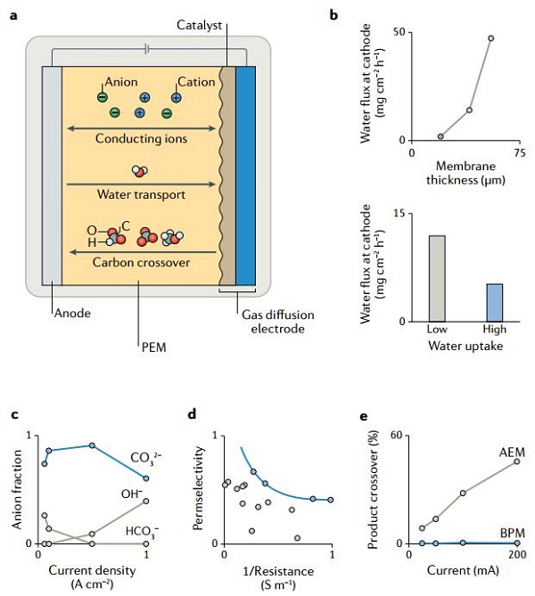 (a)聚合物电解质膜(PEM)的示意图,显示了离子的传导、水的传输以及碳产物和碳酸盐的交叉;