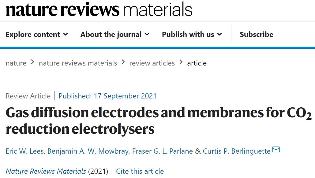文献链接:Gas diffusion electrodes and membranes for CO2 reduction electrolysers. Nature Reviews Materials, 2021, DOI: 10.1038/s41578-021-00356-2.