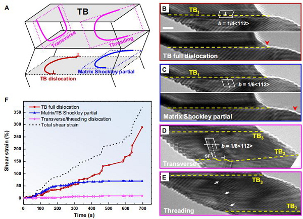 图3 Au纳米晶体剪切变形的原子尺度机制。(A)纳米孪晶中四种位错机制的示意图。(B-E)不同位错的柏氏矢量及原子尺度结构演化。(F)Au纳米晶体剪切变形过程中不同位错机制对应变的累计贡献[3]。