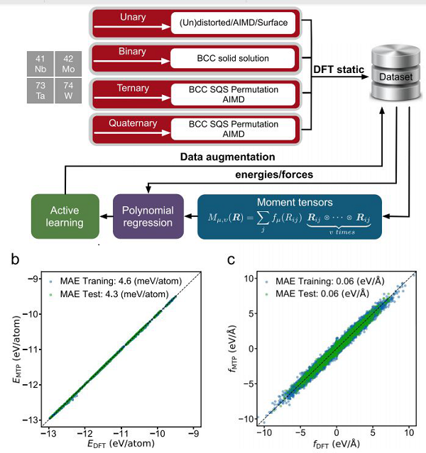 图5 机器学习原子间相互作用潜能的开发与评估。(a)构造NbMoTaW RHEA矩张量势(MTP)的流程图。给出了对b、能量和c、训练力和测试数据的MTP预测的奇偶性图[5]。