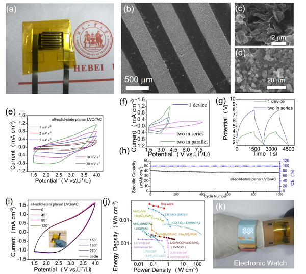 图5. LIMCs 的电化学性能:(a)LIMCs 的照片;(b) 喷印叉指电极的SEM图像;(c, d) 负极和正极俯视图的SEM图像;(e) 不同扫描速率下的CV曲线;(f) 2个串联或并联的LIMCs在5 mV s−1扫描速率下的CV曲线;(g) 2个LIMCs串联的GCD曲线;(h) 电流密度为0.02 mA cm−2 时的循环性能和库仑效率;(i) 在不同弯曲角度下测量的LIMCs的CV曲线,插图:弯曲LIMCs的照片;(j) Ragone图;(k) 由2个LIMCs串联为柔性数字手表供电的照片。