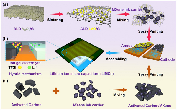 图1. LIMCs的制备示意图:(a) ALD结合固态烧结制备的LVO/石墨烯纳米复合材料作为负极;(b) 叉指电极的喷涂和基于离子凝胶电解质的LIMCs的组装;(c) AC与MXene混合作为正极