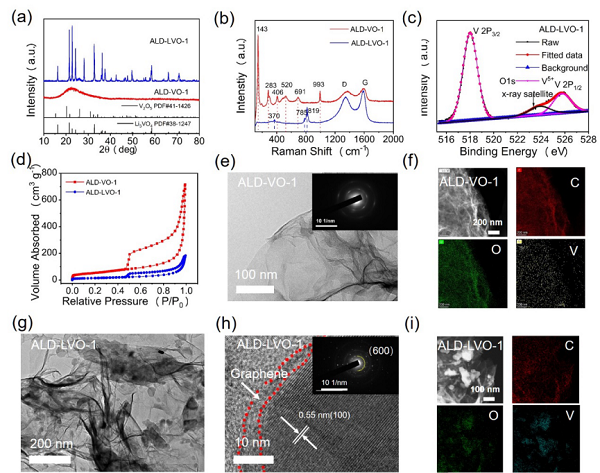 图2. ALD-VO-1和ALD-LVO-1样品的形貌结构表征:(a) XRD图;(b) 拉曼光谱;(c) ALD-LVO-1的V2p的XPS谱;(d) N2吸附/解析等温线;(e) ALD-VO-1的TEM图像,插图:选区电子衍射结果;(f) C、O、V 的EDS图像;(g, h) ALD-LVO-1的TEM图像,插图:选区电子衍射结果;(i) C、O、V 的的EDS图像