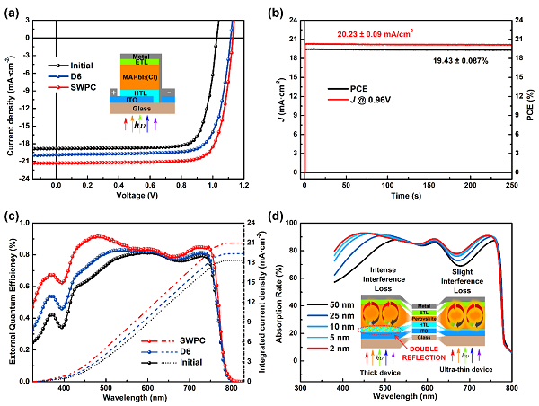 PEDOT:PSS是倒置钙钛矿太阳能电池(PSC)最具吸引力的空穴传输层(HTL)材料之一,因为其固有的优点,如低成本、高稳定性、高透光率(低折射率和消光系数)。特别是,PEDOT:PSS-HTL可以通过旋涂或喷涂商用聚离子络合物水溶液容易地沉积在透明电极上,然后进行简单的退火处理。尽管PEDOT:PSS已被广泛用作HTL,用于在器件中同时捕获空穴和阻止电子,但仍有一些关键问题阻碍了对其潜力的进一步探索。首先,通过旋转、喷涂或刀片涂层制备的相对较厚的PEDOT:PSS层(几十纳米)由于在透明电极和钙钛矿层之间形成折射腔,不利于光渗透到钙钛矿层,其折射率高于PEDOT:PSS层。此外,通过常规涂层制备的具有随机堆积的多离子络合物的PEDOT:PSS层在PEDOT:PSS/钙钛矿界面处部分不友好,这将减少载流子的提取和从钙钛矿到HTL的转移。而且,由于活性质子从未配对的PSS扩散到钙钛矿中分解钙钛矿,甚至腐蚀电极,PEDOT:PSS膜中过量的PSS不利于长期稳定性。为了解决这些问题,将添加剂加入PEDOT:PSS前驱液,插入改性层,溶剂后处理或减少PEDOT:PSS膜的厚度等方案用于提高器件的性能。其中,减小PEDOT:PSS的厚度是提高电学、光学性能的最简单方法。然而,减小PEDOT:PSS的厚度会带来另一个问题,即电极没有完全覆盖大量针孔。因此,开发一种新的沉积方法以获得均匀且无针孔的超薄PEDOT:PSS薄膜以进一步提高倒置PSC的性能是必然要求。