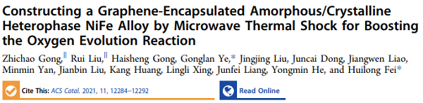 Zhichao Gong, Rui Liu, Haisheng Gong, Gonglan Ye*, Jingjing Liu, Juncai Dong, Jiangwen Liao, Minmin Yan, Jianbin Liu, Kang Huang, Lingli Xing, Junfei Liang, Yongmin He, and Huilong Fei*. Constructing a Graphene-Encapsulated Amorphous/Crystalline Heterophase NiFe Alloy by Microwave Thermal Shock for Boosting the Oxygen Evolution Reaction. ACS Catal. 2021, 11, 12284-12292. DOI:10.1021/acscatal.1c03333