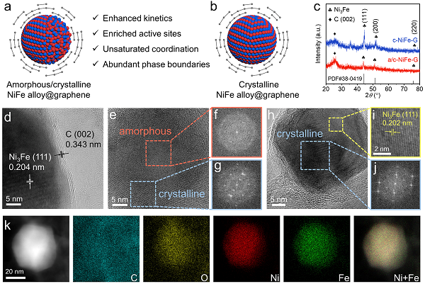 图1. 结构和成分表征。(a) a/c-NiFe-G 和 (b) c-NiFe-G 的结构示意图;(c) a/c-NiFe-G 和 c-NiFe-G 的 XRD 图;(d, e) a/c-NiFe-G 的高分辨率 TEM 图和 (f, g) 选区FFT图;(h) c-NiFe-G 的高分辨率 TEM 图和 (i)局部放大图、(j) 选区FFT图; (k) 能量色散X射线光谱图。