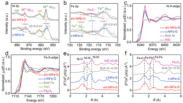 图2. 化学价态和原子配位环境表征。a/c-NiFe-G和c-NiFe-G的XPS高分辨(a) Ni 2p和(b) Fe 2p光谱;a/c-NiFe-G、c-NiFe-G和参考样品的(c) Ni K边和(d) Fe K边的XANES光谱;(e) Ni K边和(f) Fe K边的EXAFS光谱。
