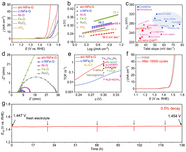 图3. 1 M KOH 中的电化学 OER 性能。(a) 在玻碳电极上测试的催化剂进行 80% iR 补偿的 LSV 曲线;(b) 相应 Tafel 图;(c) 性能对比图;(d) EIS Nyquist 图;(e) TOF对比图;(f) a/c-NiFe-G 在 10000 次 CV 循环前后的LSV曲线;(g) a/c-NiFe-G 负载于泡沫镍上的计时电位曲线。
