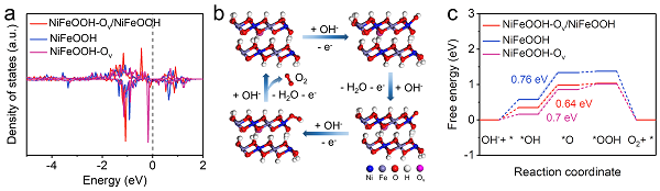 图4. DFT 计算结果。(a) 不同模型中Ni 3d轨道的PDOS;(b) 在碱性介质中 NiFeOOH-Ov/NiFeOOH的OER反应途径;(c) 平衡电位为1.23 V时OER的吉布斯自由能图。