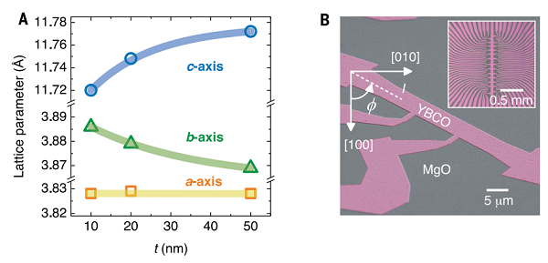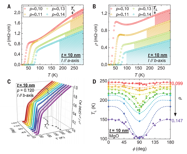 本工作使用的薄膜跨度很广,从强欠掺杂(p≈0.10)到最佳掺杂(p≈0.17)。通过改变基底和改变薄膜厚度(50nm~10nm)范围内对应变进行了改性。本工作采用(110)取向的MgO和1°的偏角(001) SrTiO3 (STO)衬底生长了未孪晶的YBCO薄膜。当YBCO厚度减小到几个单胞(t=10 nm)时,MgO上生长的薄膜表现为b轴的伸长和c轴的收缩,而单胞的总体积相对于弛豫体系没有变化。对于在邻近切割STO上生长的薄膜,YBCO单胞反而几乎与厚度无关。图1B显示了一种典型的测量电阻率随温度变化的装置。采用碳掩模结合电子束光刻和Ar+离子铣削的方法对器件进行YBCO方向的角度为φ的图形化。