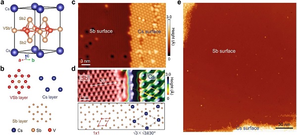 图一、CsV3Sb5 的原子结构和表面鉴定