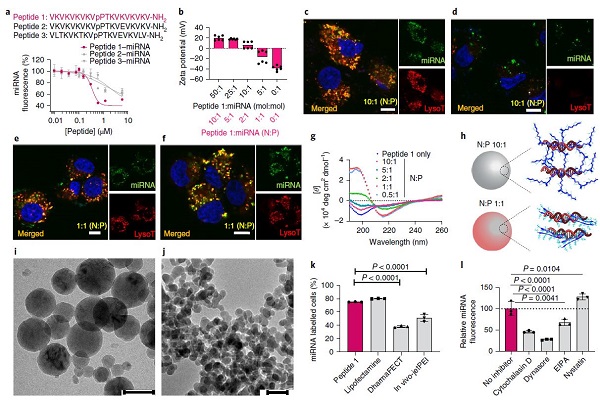 (j) 1:1 (N:P) 多肽1:miRNA的冷冻电子微图像;