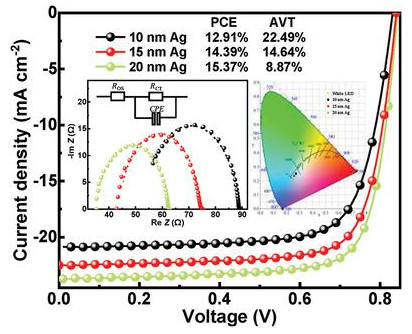 半透明有机太阳能电池(OSC)由于其特殊的应用场景最近受到了广泛关注。国家纳米科学中心丁黎明和北京交通大学张福俊等人采用在可见光范围内具有窄光子捕获的宽带隙聚合物D18和具有近红外光子捕获的小分子N3构建了半透明OSC。具有10 nm Ag的半透明OSC实现了2.90%的最高光利用效率,能量转化效率为12.91%,平均可见光透射率(AVT)为 22.49%,这是已报道的半透明OSC的最佳性能之一。相关研究以“Wide Bandgap Polymer with Narrow Photon Harvesting in Visible Light Range Enables Efficient Semitransparent Organic Photovoltaics”为题目,发表在AFM上。DOI: 10.1002/adfm.202107934
