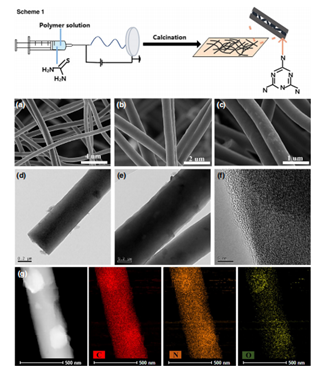 图1. 示意图1)C3N4@NCNF复合材料形成过程; a-c) C3N4@NCNF−600的SEM图; d-f)C3N4@NCNF−600的TEM和HRTEM图像; g) C3N4@NCNF−600TEM图明确显示C、N、O元素。
