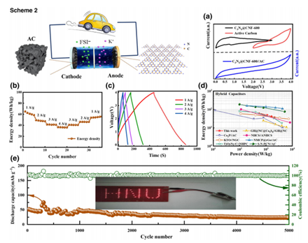 图3. 示意图2)双碳PIHCs C3N4@NCNF-600//AC电化学性能示意图; a)半电池中C3N4@NCNF-600和AC电极的CV曲线(上),C3N4@NCNF-600//ACPIHCs(下); b)倍率性能; c)不同电流密度的GCD曲线; d)与其他工作比较的Ragone图; e)5A g−1的循环稳定性(插图是由一个组装的C3N4@NCNF-600//ACPIHCs供电的LED的数码照片)。