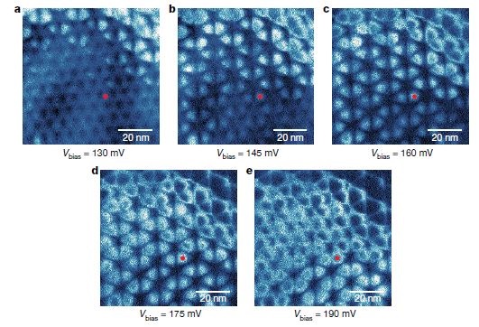 (a-e)电子填充2/3时,广义维格纳静态的dI/dV映射测量:Vbias=130 mV(a),Vbias=145 mV(b),Vbias=160 mV(c),Vbias=175 mV(d),Vbias=190 mV(e)。