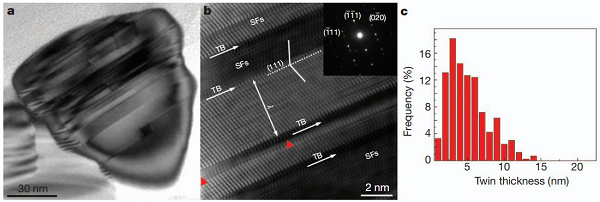 纳米孪晶材料的强度约着孪晶厚度的增加而增大,二者之间复合Hall-Patch效应。该研究发现,当孪晶的厚度降低到某一临界值时,变形机制发生转变,材料开始软化。此时,由位错堆积和切割孪晶面引起的经典Hall-Petch型强化转变为位错成核控制的软化机制,部分位错平行于孪晶面形核和运动导致孪晶界迁移。