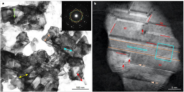 通过特别制备的BN前驱体纳米颗粒合成的纳米孪晶立方氮化硼材料,平均孪晶厚度为3.5 nm。研究发现纳米孪晶氮化硼的综合物力性能要比传统的超细晶材料高出一个数量级左右,在高温下展示了极高的硬度。
