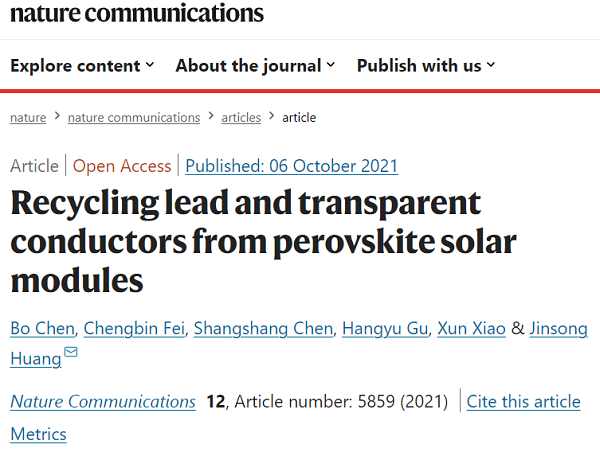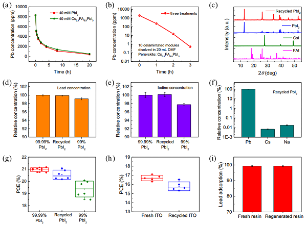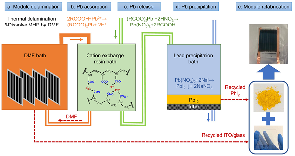 来自北卡罗来纳大学教堂山分校的黄劲松教授团队报告了一项钙钛矿型太阳能组件的报废材料管理方案,以回收有毒的铅和有价值的透明导体,以保护环境,并从回收材料中创造显著的经济效益。本文用弱酸性阳离子交换树脂将退役模块中的铅分离出来,以可溶性Pb(NO3)2的形式释放出来,再以PbI2的形式沉淀再利用,回收效率为99.2%。利用热分层拆卸封装的模块,使其具有完整的透明导体和盖子玻璃。基于回收的碘化铅和回收的透明导体的再填充器件表现出与基于全新原材料的器件相当的性能。成本分析表明,这种回收技术在经济上是有很大吸引力的。相关工作以题为“Recycling lead and transparent conductors from perovskite solar modules”的文章在《Nature Communications》发表。