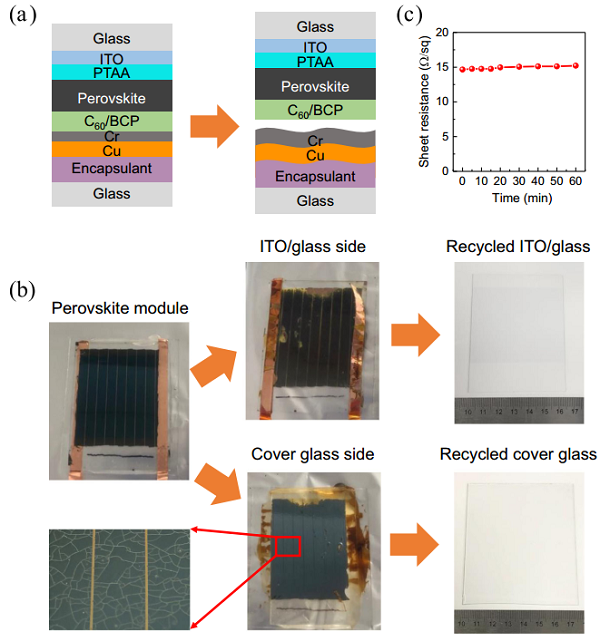 本文发现在高温下进行短暂的热处理可以有效地拆卸封装的钙钛矿太阳能组件,并获得完整的 ITO 玻璃和后盖玻璃。在 250 °C 下保持2分钟后,聚合物密封剂熔化,这在电子传输层 (ETL) 和金属电极的界面处产生了使钙钛矿太阳能模块分层的应变,如图2a中作为密封剂的环氧树脂所示。卤化铅钙钛矿薄膜和ETL停留在ITO/玻璃一侧,然后ETL用1,2-二氯苯(DCB)清洗,卤化铅钙钛矿溶解在DMF中进行后续铅回收(图 2b)。在洗掉空穴传输层和其他残留物后,ITO/玻璃可以重新用于模块再制造。本文发现回收过程后 ITO/玻璃基板的电导率没有明显变化。即使在 250°C 下退火 1 小时后,ITO/玻璃的电导率也仅从 14.6 Ω/sq 略微增加到 15.2 Ω/sq(图2c)。