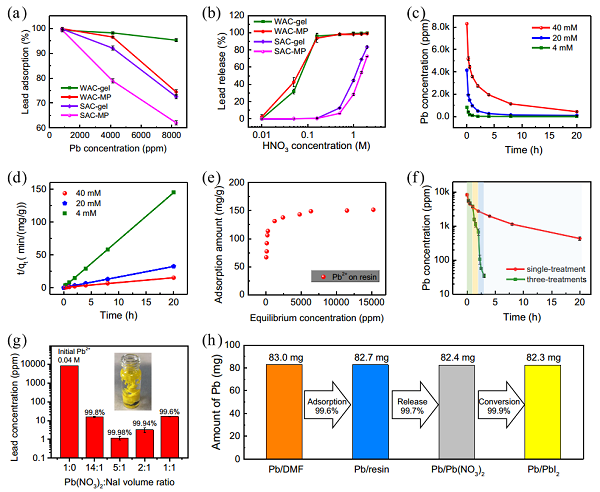 图3a-b比较了弱酸性阳离子(WAC)交换树脂与基于凝胶和大孔(MP)基质结构的羧酸官能团的铅回收性能,以及强酸性阳离子(SAC)交换树脂与基于凝胶和MP基质的磺酸官能团的铅回收性能。在二甲基甲酰胺中,对于10 mL的4 mM PbI2(铅浓度为830ppm),四种阳离子交换树脂在与1g树脂搅拌20 h后,都能从二甲基甲酰胺溶液中吸附99.2%以上的Pb2+离子(图3a)。当初始铅浓度增加到40 mM时,WAC-gel对铅的吸附率保持在95%的高水平,而对其他三种阳离子交换树脂的铅吸附率下降到80%以下(图3a)。对于使用 HNO3再生剂的铅释放过程,图3b所示的羧酸型阳离子交换树脂WAC-gel和WAC-MP在HNO3再生剂浓度大于0.16 M时,在再生30 分钟后都释放了大部分吸附的Pb2+。然而,即使HNO3再生剂浓度高达2 M ,磺酸阳离子交换树脂SAC-gel和SAC-MP都显示出较低的铅释放率(图 3b).