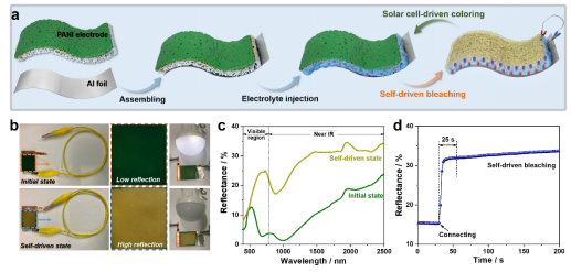 最近,北京工业大学的张倩倩和汪浩教授(共同通讯作者)团队报道了一种基于聚苯胺柔性自驱动红外电致变色器件,其中聚苯胺(PANI)作为红外电致变色阴极材料,金属铝箔作阳极材料。在无外加电源的条件下,当两个电极连接时,在内部自发的电化学过程驱动下,PANI电极自发地实现由绿色态向漂白态转变,从而使得器件切换到高红外反射模式,同时还实现了较大的温度调控。此外,该柔性红外器件具有优异的光学(高红外反射调制幅度(ΔR>20% @1500nm)),高的着色效率(93.6 cm2 C−1),快速可逆切换(≤7 s))和热调控(ΔT≈5.6 ℃)性能。值得注意的是,该器件可通过太阳能光伏充电,将器件由高反射状态恢复到低红外反射状态,使得其在着色和褪色过程中的能耗得到显著降低。该红外柔性电致变色器件能够在低功率模式下实现有效的光学和热调节,有望在在军事伪装和热控制等领域获得重要应用。相关研究成果以题为“A Self-Driven Infrared Electrochromic Device with Tunable Optical and Thermal Management”发表在国际知名期刊《ACS Applied Materials & Interfaces》,北京工业大学材料与制造学部的博士生龚辉为第一作者。