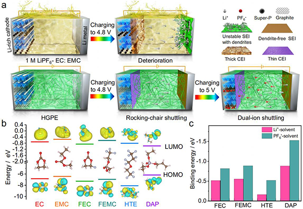 (c) FEC,FEMC,HTE和DAP对Li+和PF6–的结合能。