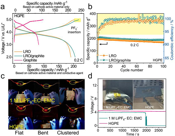 (c)由Li|1 M LiPF6-EC:EMC|LRO/石墨混合电池和Li|HGPE|LRO/石墨软包电池驱动的红色LEDs的光学图像;