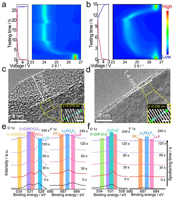 (e,f)Li|1 M LiPF6-EC:EMC|LRO/石墨电池和Li|HGPE|LRO/石墨电池在循环一次后的KS6石墨正极的XPS图谱。