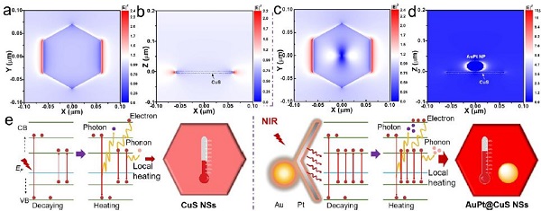 (c,d)AuPt@CuS纳米片在808nm激光激发下的电场分布;