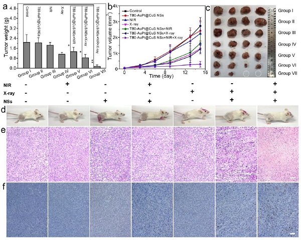 (f)γ-H2AX染色代表第3天肿瘤切片的DSB。